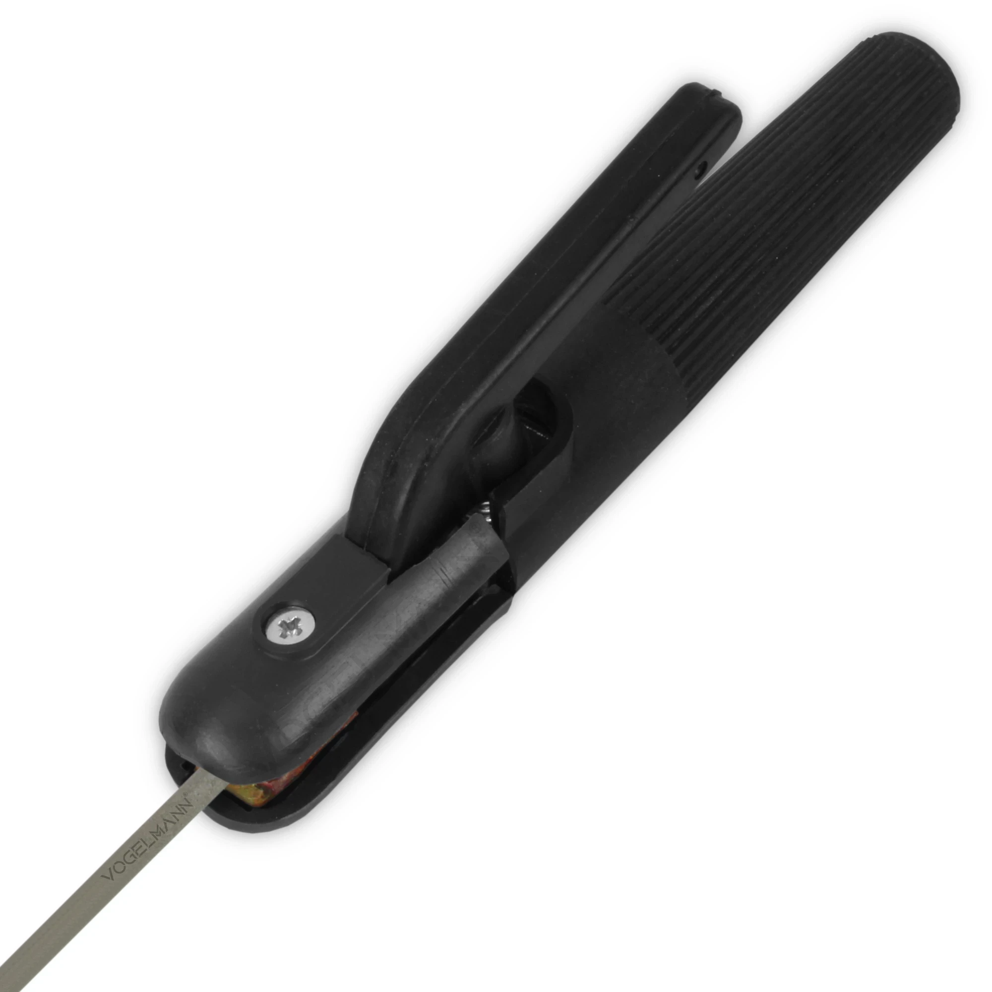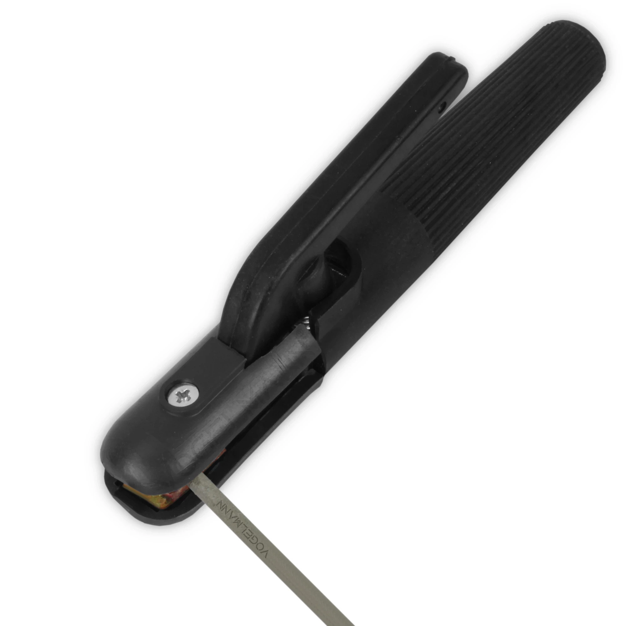 Držák elektrod Vogelmann je určen pro ruční svařování metodou MMA ve všech polohách. Konstrukce umožňuje upnutí elektrody ve třech polohách, což zajišťuje pohodlnou manipulaci při různých typech svarů. Čelisti jsou vyrobeny z precizně obráběných měděných dílů pro vysokou vodivost a odolnost. Kovové části jsou chráněny krytkami a ergonomickou rukojetí z odolného plastu.