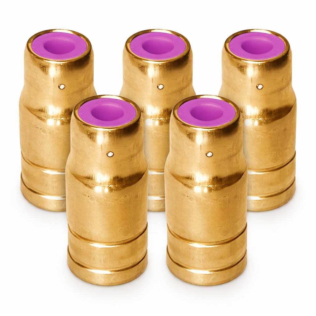 Sada 5 plynových hubíc VOGELMANN typu FLUX pre horáky MB-15, určených na bezplynové zváranie samoochranným drôtom (FLUX). Hubice neplnia funkciu plynovej ochrany – slúžia na vedenie drôtu a ochranu prúdového prievlaku počas zvárania metódou MIG bez plynu.