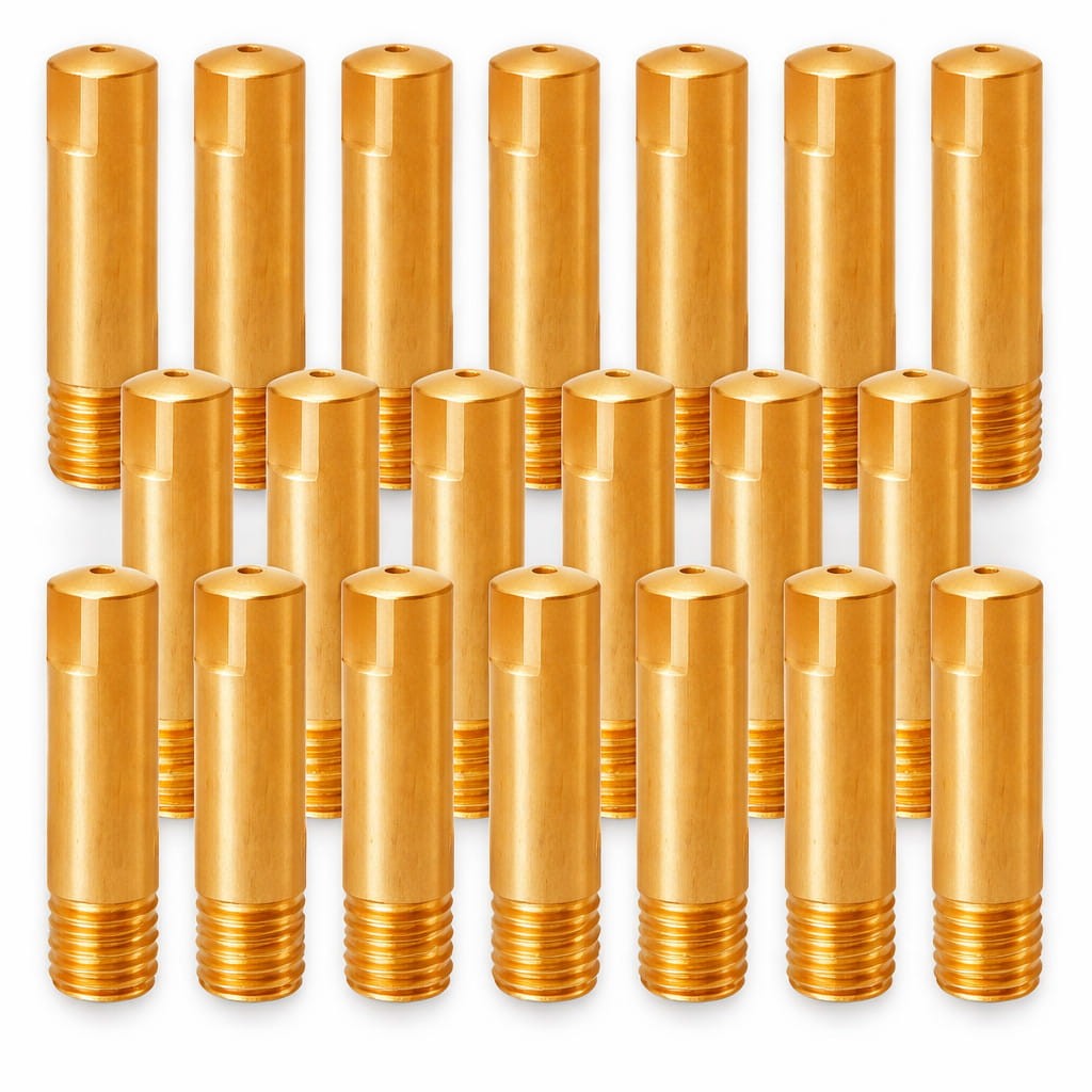 Sada 20 kusov prúvlakových špičiek Vogelmann určených na MIG zváranie hliníkovým drôtom ⌀1,0 mm. Sú vyrobené z technickej medi a majú mierne zväčšený otvor (~1,1 mm), ktorý umožňuje plynulé podávanie mäkkého hliníkového drôtu bez rizika zaseknutia.