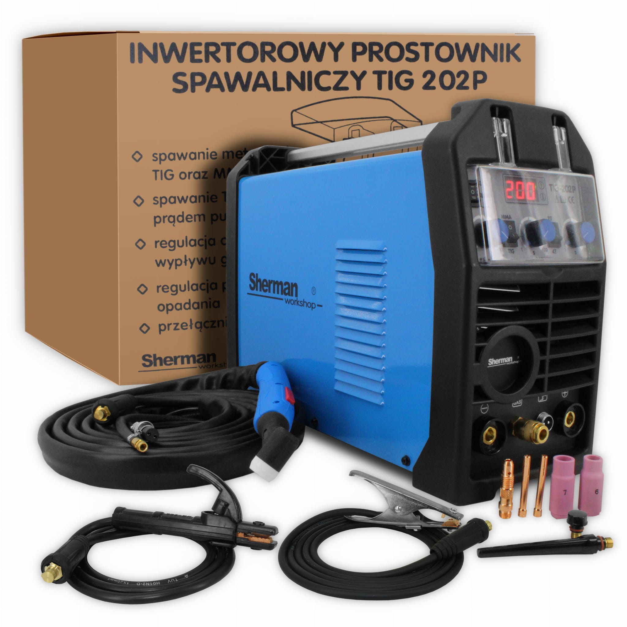 Zvárací invertor Sherman 202P TIG DC je určený na ručné zváranie konštrukčných ocelí obalenými elektródami metódou MMA a na zváranie kvalitných ocelí, medi a jej zliatin netaviteľnou elektródou v ochrane inertného plynu metódou TIG s HF bezkontaktným zapálením oblúka. Zariadenie je vhodné na dielenské práce a príležitostnú výrobu. Ponúka pokročilé funkcie pre presné nastavenie zváracích parametrov a stabilnú prevádzku. Vďaka modernej technológii dosahuje vysokú účinnosť pri kompaktných rozmeroch.
