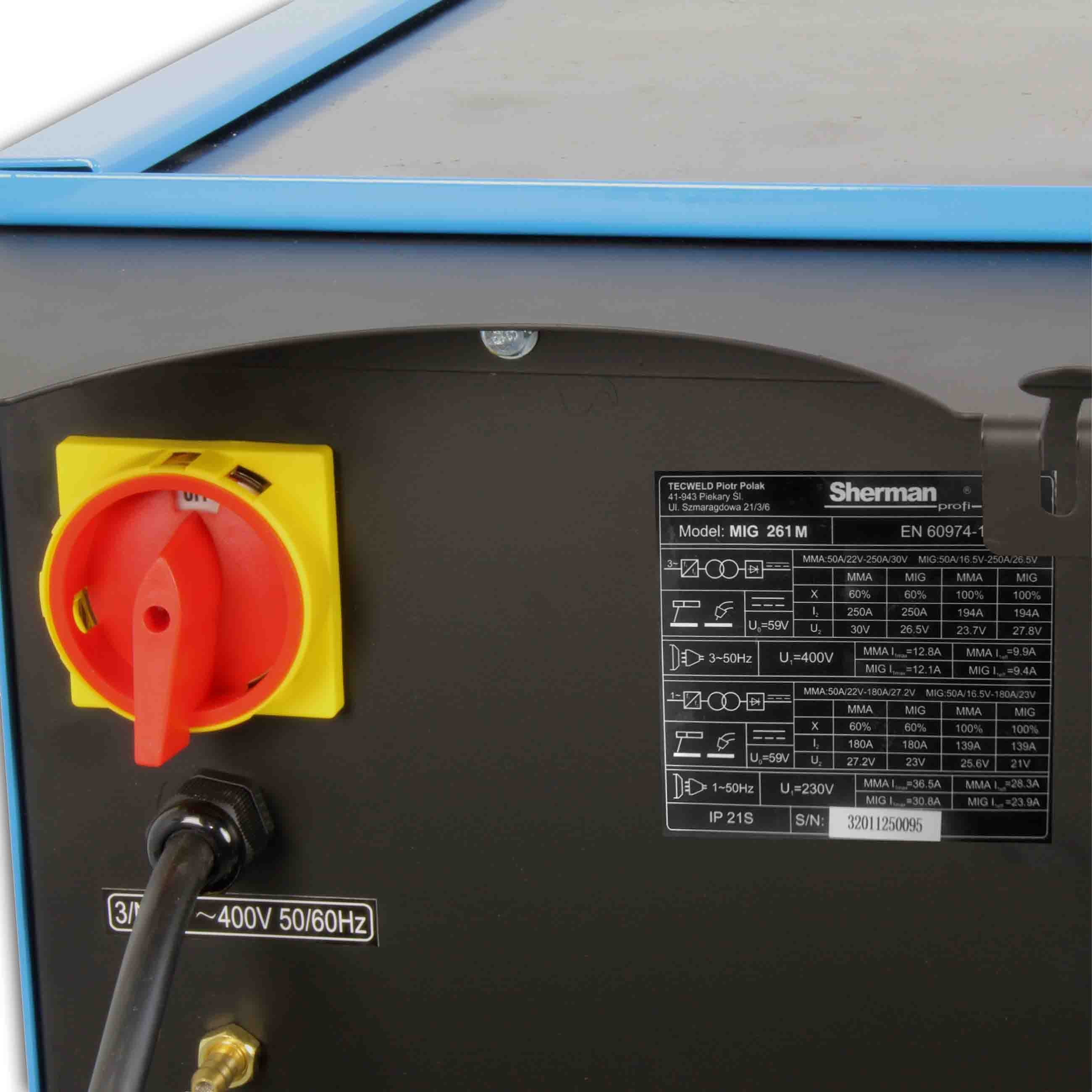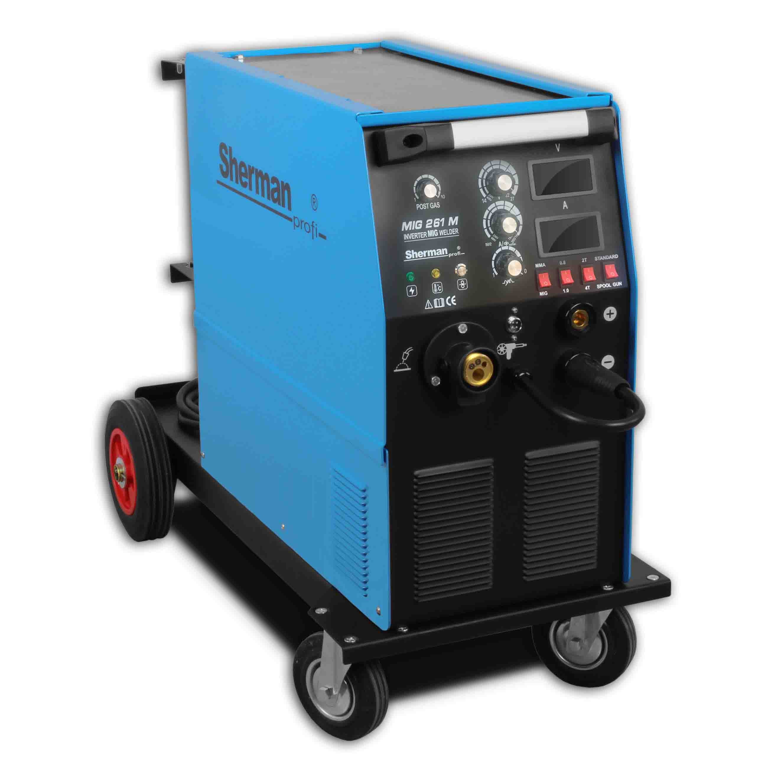 Zvárací invertor Sherman MIG 261M/4R je určený na ručné zváranie ocele a neželezných kovov v ochrannom plyne metódou MIG/MAG a zváranie obalenou elektródou metódou MMA. Zariadenie umožňuje aj bezplynové zváranie plneným drôtom a prácu so spool gun horákom pre cievky s priemerom 100 mm. Je vhodné pre dielenské aj profesionálne použitie v zastrešených priestoroch. Vďaka robustnej konštrukcii a pokročilým funkciám ponúka spoľahlivú a komfortnú prevádzku.