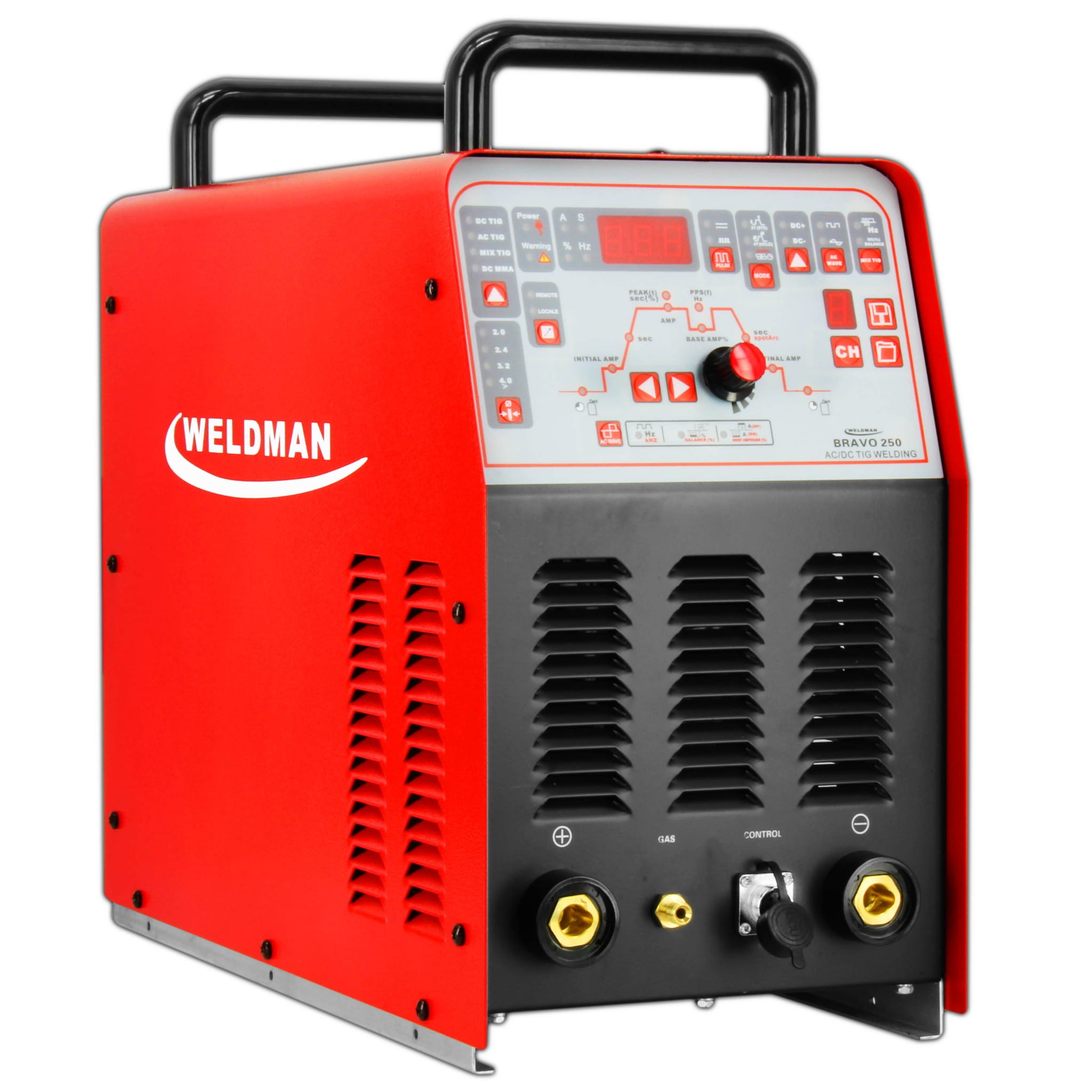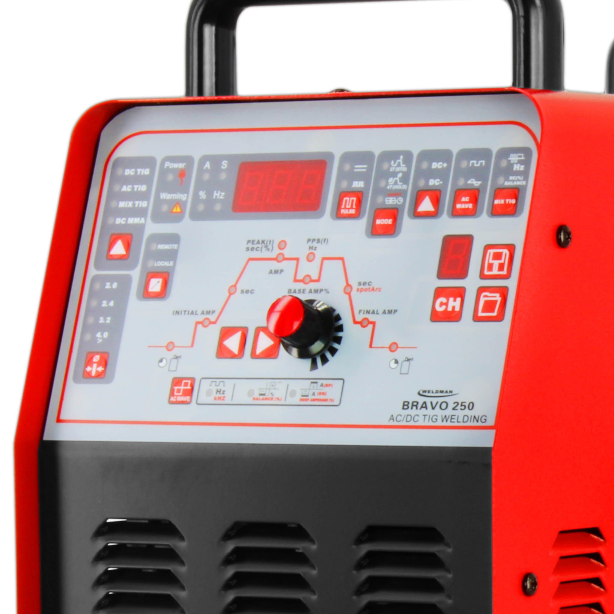 Weldman Bravo TIG 250 AC/DC je výkonný invertorový zvárací stroj vyrobený technológiou IGBT, určený na zváranie metódami TIG AC, TIG AC PULS, TIG DC, TIG DC PULS, TIG MIX (AC+DC) a MMA. Umožňuje zváranie všetkých kovov vrátane hliníka pri použití striedavého aj jednosmerného prúdu. Vďaka širokým možnostiam nastavenia a kombinovaným režimom poskytuje vysokú kvalitu zvarov na tenkých aj hrubších materiáloch. Zariadenie je vhodné pre dielenské aj priemyselné použitie.